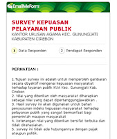 Dalam kerangka meningkatkan pelayanan kepada masyarakat, Kantor Urusan Agama Kecamatan Gunungjati terus berbenah baik dri segi fasilitas fisik maupun perangkat lunak sehingga diharapkan dapat memuaskan masyarakat sebagai user layanan kami. Untuk melihat Indeks Kepuasan Masyarakat (IKM) dari pelayanan Pencatatan Nikah yang diselenggarakan oleh KUA, dengan berpedoman kepada Keputusan Menteri Pendayagunaan Aparatur Negara Nomor : Kep/25/M.PAN/2/2004 maka telah diluncurkan Survey Kepuasan Masyarakat Terhadap pelayanan publik KUA dengan responden kurang lebih 150 orang. Untuk versi online kami sediakan juga di blog ini dengan mengklik tautan disini SURVEY IKM KUA atau dari blog kami pilih menu LAYAYAN ONLINE pilih Survey IKM KUA kami ucapkan terima kasih atas partisipasi saudara mengikuti survey kami. Semoga menjadi bahan perbaikan bagi kami dalam melaksanakan pelayanan publik pada masa mendatang.