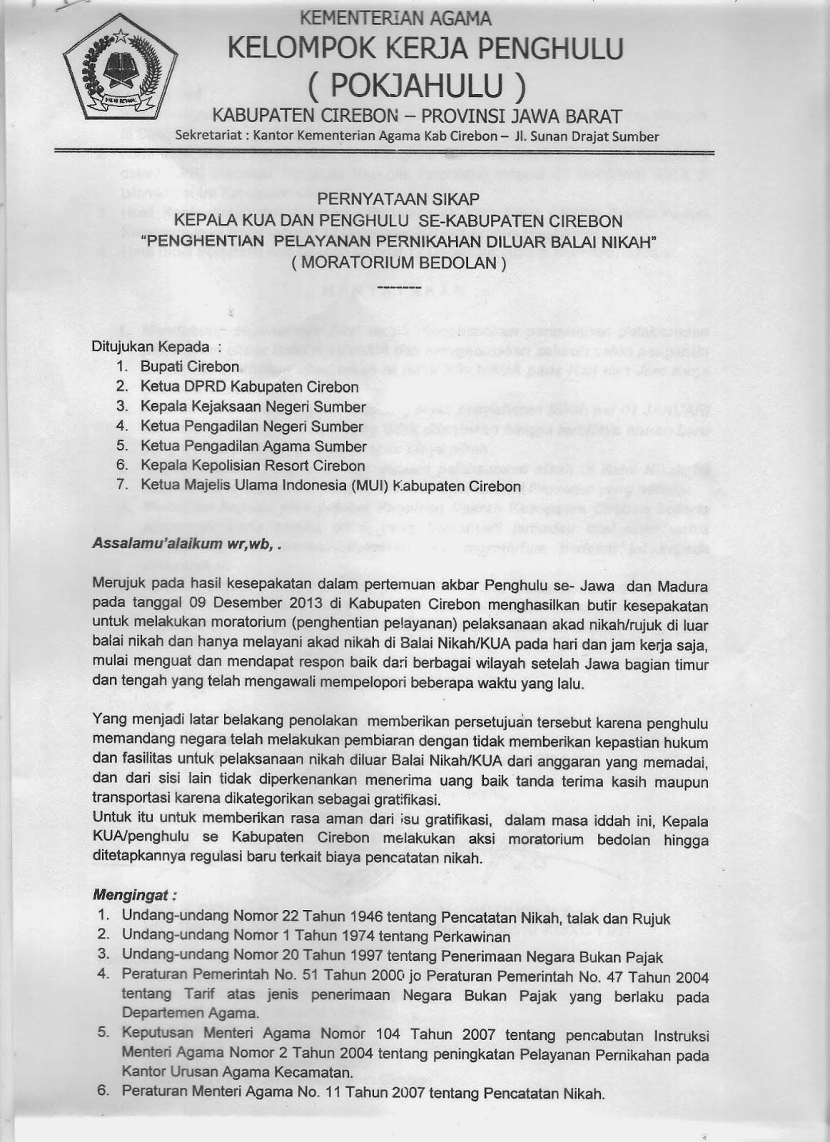 Cirebon tentang Penghentian Pelayanan Pernikahan diluar Balai Nikah (