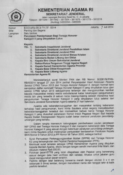 Gunungjati (28/06/2014); Berita yang sangat ditunggu bagi para honorer Kategori 1 dan 2 dari Kementerian Agama akhirnya datang juga. Daftar kelulusan tes CPNS honorer kategori 2 akhirnya dirilis pada hari Jum'at 27 Juni 2014 dan diumukan secara terbuka. Bagi anda yang ingin mengetahui hasil kelulusan tersebut dapat melihat di link berikut :