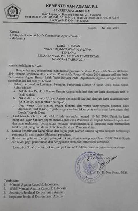 Gunungjati (08/07/2014); Kabar gembira bagi kalangan Kantor Urusan Agama (KUA) di seluruh Indonesia atas terbitnya Peraturan pemerintah baru pengganti PP No. 47 tahun 2004 tentang PNBP biaya pencatatan Nikah dan Rujuk pada Depertemen Agama. Selengkapnya simak aturan terbaru dalam PP No. 48 Tahun 2014 pada link disini, atau langsung menuju sumber utamanya di web Sekretariat negara. Selanjutnya kita tunggu aturan pelaksanaannya dalam Keputusan Menteri Agama dan Menteri Keuangan yang akan kita infokan setelah aturan tersebut turun dan setelah aturan tersebut turun mulai dapat diaplikasikan di KUA.