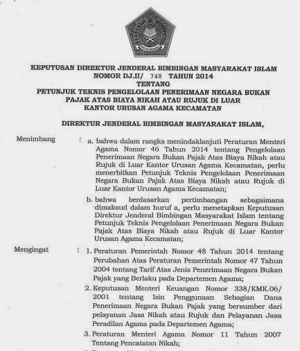 Keputusan Direktur Jendral Bimbingan Masyarakat Islam Nomor DJ.II/748 Tahun 2014 tentang Petunjuk Teknis Pengelolaan Penerimaan Negara Bukan Pajak atas Biaya Nikah atau Rujuk diluar Kantor Urusan Agama Kecamatan unduh disini.