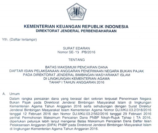 Surat Edaran yang sangat dinanti kemunculannya akhirnya diterbitkan Dirjen Perbendaharaan Kementerian Keuangan. SE-19/PB/2016 tanggal 23 Maret 2016 tentang batas maksimum pencairan dana PNBP-NR tahap 1 Tahun Anggaran 2016. Lihat alokasi untuk kabupaten/kota anda silahkan unduh disini